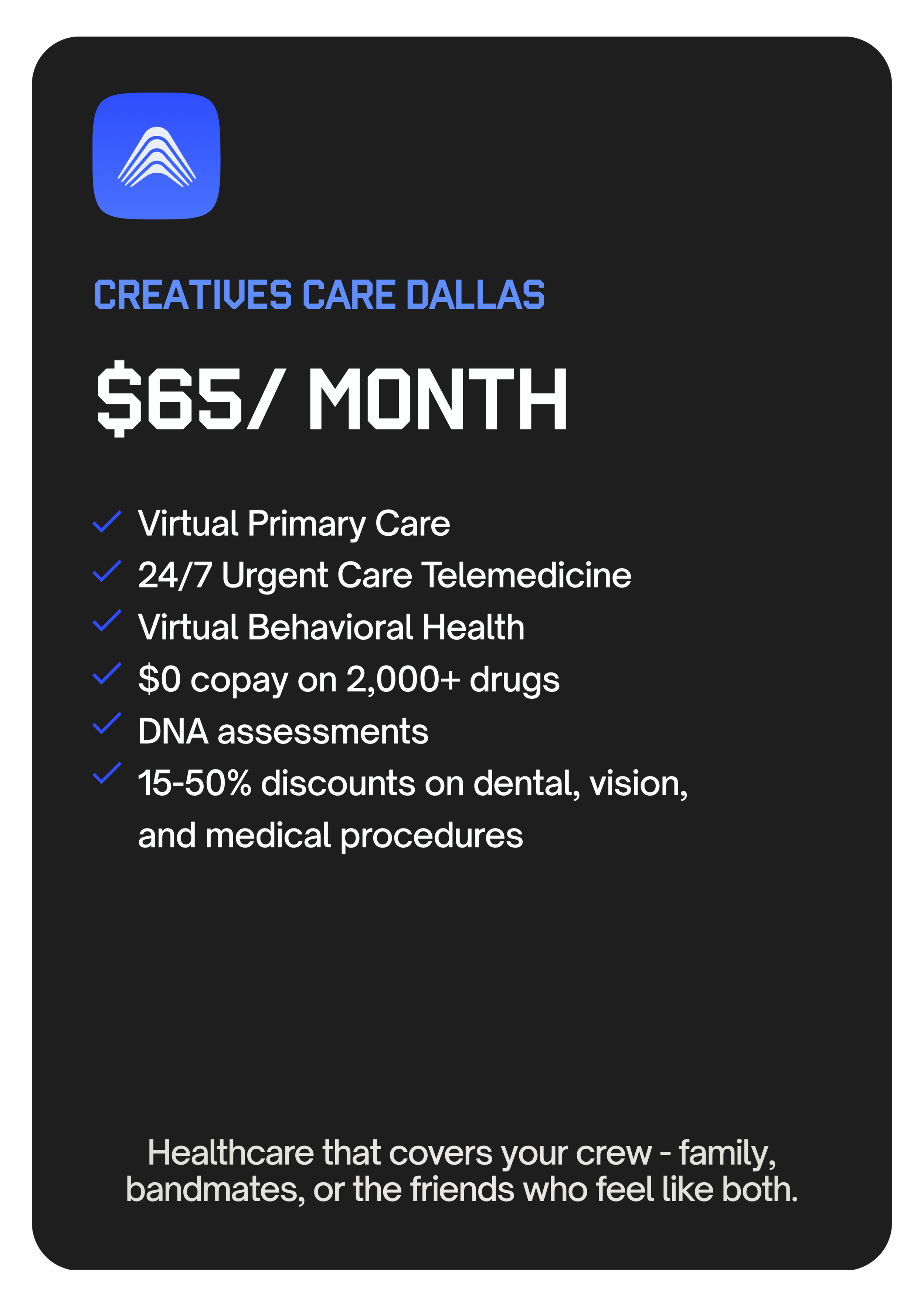 No copays. No confusion. Just coverage built for your life — whether you’re on tour, in the studio, or holding it all together at home.